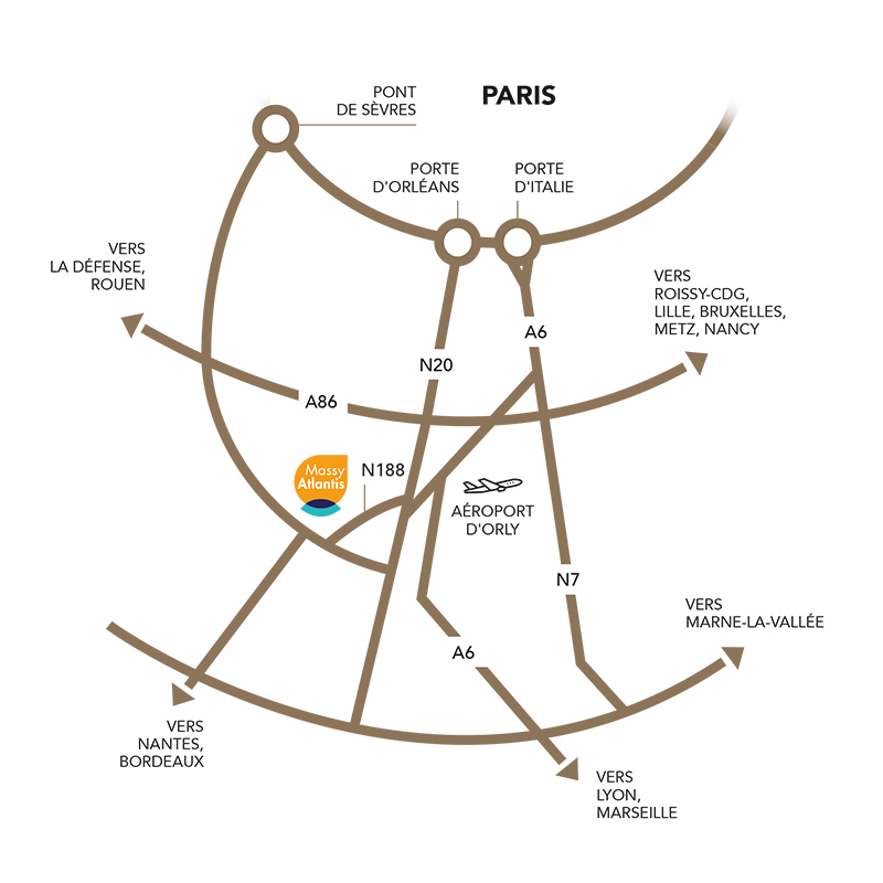 Massy s’inscrit au croisement des 3 axes routiers majeurs que sont l’A6, l’A10 et la N188. L’échangeur autoroutier, situé directement sur le pôle, vous permet un accès rapide à l’ensemble du réseau francilien. À 15 kilomètres de Paris, vous êtes relié à Paris Quartier Central des Affaires en 35 minutes et au Quartier d’Affaires de La Défense en 30 minutes.